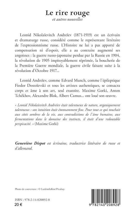 Leonid Nikolaïevitch Andreïev (1871-1919) est un écrivain et dramaturge russe, considéré comme le représentant littéraire de l’expressionnisme russe. L’Histoire ne lui a pas apporté de compensation ni d’espoir, elle a au contraire augmenté ses angoisses : la guerre russo-japonaise perdue par la Russie en 1904, la révolution de 1905 impitoyablement réprimée, la boucherie de la Première Guerre mondiale, la guerre civile faisant suite à la révolution d’Octobre 1917...Leonid Andreïev, comme Edvard Munch, comme l’épileptique Fiodor Dostoïevski et tous les artistes authentiques, se consacra corps et âme à son art, seul exutoire. Maxime Gorki, AntonTchékhov, Alexandre Blok, Albert Camus... ont loué son oeuvre.« Leonid Nikolaïevitch Andreïev était talentueux de nature, organiquement talentueux : son intuition était étonnamment fine. Pour tout ce qui touchaitaux côtés sombres de la vie, aux contradictions de l’âme humaine, aux fermentations dans le domaine des instincts, il était d’une redoutable perspicacité. » (Maxime Gorki)
