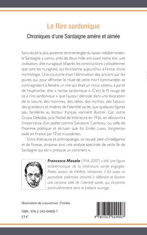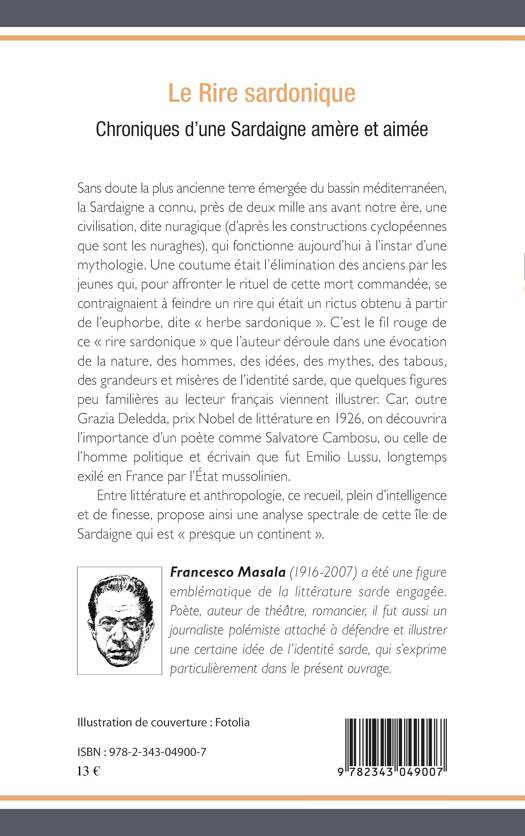 Sans doute la plus ancienne terre émergée du bassin méditerranéen, la Sardaigne a connu, près de deux mille ans avant notre ère, une civilisation qui fonctionne aujourd'hui à l'instar d'une mythologie. Une coutume était l'élimination des anciens par les jeunes qui se contraignaient à feindre un rire qui était un rictus obtenu à partir de l'euphorbe, dite "herbe sardonique". C'est le fil rouge de ce "rire sardonique" que l'auteur déroule dans une évocation de la nature, des hommes, des idées, des mythes, des tabous, des grandeurs et misères de l'identité sarde.