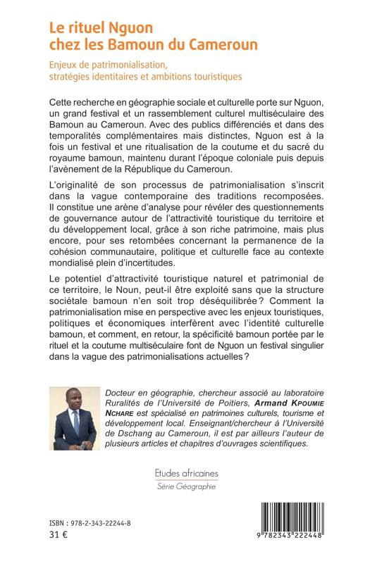 Cette recherche en géographie sociale et culturelle porte sur Nguon, un grand festival et un rassemblement culturel multiséculaire des Bamoun au Cameroun. Avec des publics différenciés et dans des temporalités complémentaires mais distinctes, Nguon est à la fois un festival et une ritualisation de la coutume et du sacré du royaume bamoun, maintenu durant l'époque coloniale puis depuis l'avènement de la République du Cameroun. Le potentiel d'attractivité touristique naturel et patrimonial de ce territoire, le Noun, peut-il être exploité sans que la structure sociétale bamoun n'en soit trop déséquilibrée ?