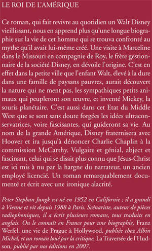 Ce roman, qui fait revivre au quotidien un Walt Disney vieillissant, nous en apprend plus qu'une longue biographie sur la vie de cet homme qui se trouva confronté au mythe qu'il avait lui-même créé. Une visite à Marceline dans le Missouri en compagnie de Roy, le frère gestionnaire de la société Disney, en dévoile l'origine. C'est en effet dans la petite ville que l'enfant Walt, élevé à la dure dans une famille de paysans pauvres, aurait découvert la nature qui ne ment pas, les sympathiques petits animaux qui peupleront son oeuvre, et inventé Mickey, la souris planétaire. C'est aussi dans cet Etat du Middle West que se sont sans doute forgées les idées ultraconservatrices, voire fascisantes, qui guideront sa vie. Au nom de la grande Amérique, Disney fraternisera avec Hoover et ira jusqu'à dénoncer Charlie Chaplin à la commission McCarthy. Vulgaire et génial, abject et fascinant, celui qui se disait plus connu que Jésus-Christ est ici mis à nu par la hargne du narrateur, un ancien employé licencié. Un roman remarquablement documenté et écrit avec une ironique alacrité.