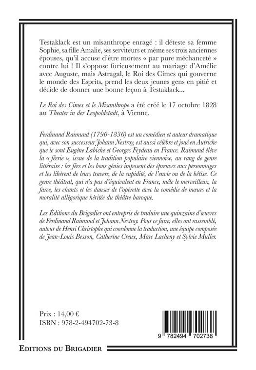 Testaklack est un misanthrope enragé : il déteste sa femme Sophie, sa fille Amalie, ses serviteurs et même ses trois anciennes épouses, qu’il accuse d’être mortes « par pure méchanceté » contre lui ! Il s’oppose furieusement au mariage d’Amélie avec Auguste, mais Astragal, le Roi des Cimes qui gouverne le monde des Esprits, prend les deux jeunes gens en pitié et décide de donner une bonne leçon à Testaklack…