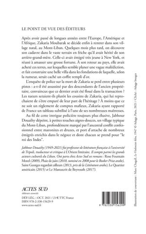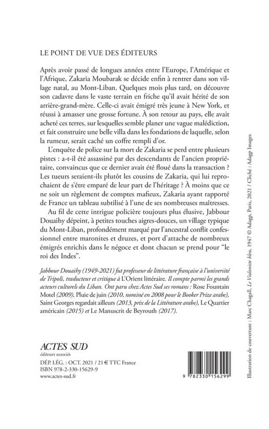 Après avoir passé de longues années entre l'Europe, l'Amérique et l'Afrique, Zakaria Moubarak se décide enfin à rentrer dans son village natal, au Mont-Liban. Quelques mois plus tard, on découvre son cadavre dans le vaste terrain en friche qu'il avait hérité de son arrière-grand-mère. Celle-ci avait émigré très jeune à New York, et réussi à amasser une grosse fortune. À son retour au pays, elle avait acheté ces terres, sur lesquelles semble planer une vague malédiction, et fait construire une belle villa dans les fondations de laquelle, selon la rumeur, serait caché un coffre rempli d'or. L'enquête de police sur la mort de Zakaria se perd entre plusieurs pistes : a-t-il été assassiné par des descendants de l'ancien propriétaire, convaincus que ce dernier avait été floué dans la transaction ? Les tueurs seraient-ils plutôt les cousins de Zakaria, qui lui reprochaient de s'être emparé de leur part de l'héritage ? À moins que ce ne soit un règlement de comptes mafieux, Zakaria ayant rapporté de France un tableau subtilisé à l'une de ses nombreuses maîtresses. Au fil de cette intrigue policière toujours plus élusive, Jabbour Douaihy dépeint, à petites touches aigres-douces, un village typique du Mont-Liban, profondément marqué par l'ancestral conflit confessionnel entre maronites et druzes, et port d'attache de nombreux émigrés enrichis dans le négoce et dont chacun se prend pour "le roi des Indes".