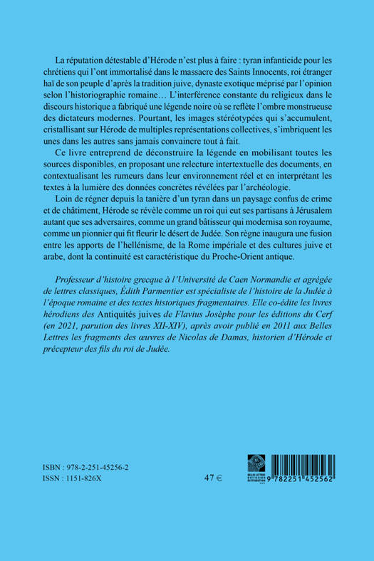 La réputation détestable d’Hérode n’est plus à faire : tyran infanticide pour les chrétiens qui l’ont immortalisé dans le massacre des Saints Innocents, roi étranger haï de son peuple d’après la tradition juive, dynaste exotique méprisé par l’opinion selon l’historiographie romaine… L’interférence constante du religieux dans le discours historique a fabriqué une légende noire où se reflète l’ombre monstrueuse des dictateurs modernes. Pourtant, les images stéréotypées qui s’accumulent, cristallisant sur Hérode de multiples représentations collectives, s’imbriquent les unes dans les autres sans jamais convaincre tout à fait.