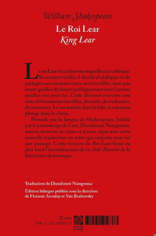 Possédé par la langue de Shakespeare, habité par le personnage de Lear, Dieudonné Niangouna, auteur, metteur en scène et acteur, signe avec cette nouvelle traduction un texte qui emporte tout sur son passage. Cette version du Roi Lear hisse au plus haut l'incandescence