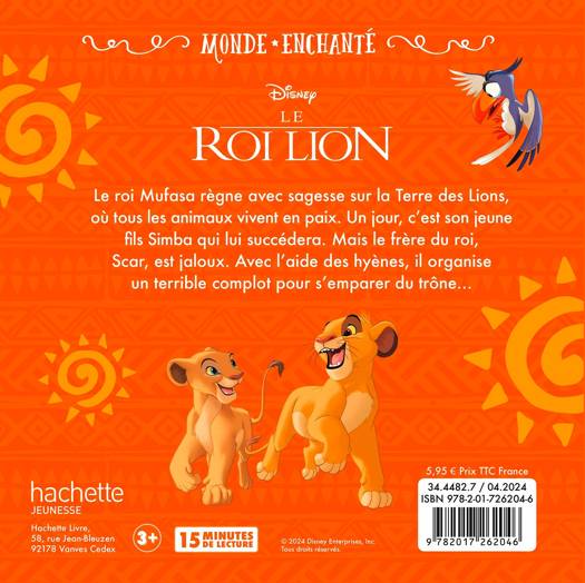 L’histoire :Le roi Mufasa règne avec sagesse sur la Terre des Lions, où tous les animaux vivent en paix. Un jour, c’est son jeune fils Simba qui lui succédera. Mais le frère du roi, Scar, est jaloux. Avec l’aide des hyènes, il organise un terrible complot pour s’emparer du trône…