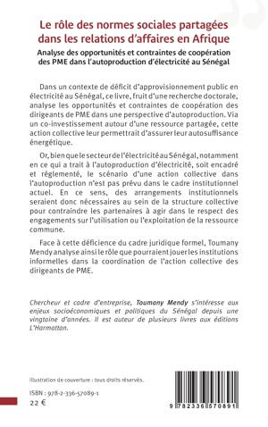 Dans un contexte de déficit d'approvisionnement public en électricité au Sénégal, ce livre, fruit d'une recherche doctorale, analyse les opportunités et contraintes de coopération des dirigeants de PME dans une perspective d'autoproduction. Via un co-investissement autour d'une ressource partagée, cette action collective leur permettrait d'assurer leur autosuffisance énergétique. Or, bien que le secteur de l'électricité au Sénégal, notamment en ce qui a trait à l'autoproduction d'électricité, soit encadré et réglementé, le scénario d'une action collective dans l'autoproduction n'est pas prévu dans le cadre institutionnel actuel. En ce sens, des arrangements institutionnels seraient donc nécessaires au sein de la structure collective pour contraindre les partenaires à agir dans le respect des engagements sur l'utilisation ou l'exploitation de la ressource commune. Face à cette déficience du cadre juridique formel, Toumany Mendy analyse ainsi le rôle que pourraient jouer les institutions informelles dans la coordination de l'action collective des dirigeants de PME.
