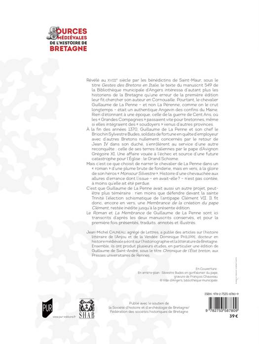 Révélé au XVIIIe siècle par les bénédictins de Saint-Maur, sous le titre Gestes des Bretons en Italie, le texte du manuscrit 549 de la Bibliothèque municipale d’Angers intéressa d’autant plus les historiens de la Bretagne qu’une erreur de la première édition leur fit chercher son auteur en Cornouaille. Pourtant, le chevalier Guillaume de La Penne – et non La Pérenne, comme on le crut longtemps – était un authentique Angevin des confins du Maine. Rien d’étonnant à une époque, celle de la guerre de Cent Ans, où les « Grandes Compagnies » passaient vite pour bretonnes, même si elles intégraient des « soudoyers » venus d’autres provinces.