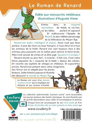 Entrez dans le royaume merveilleux de Noble le roi-lion où les bêtes parlent et agissent en humains. Et redécouvrez l’épopée de Renard, le plus célèbre personnage de la littérature du Moyen-âge. Renard est malin, intelligent et joyeux. Aussi rusé que beau parleur, il joue des tours au loup Ysengrin, à l’ours Brun et à tous les animaux de la forêt. Renard s’en sort toujours face à des animaux plus puissants car la malice peut vaincre la force brute. Mais il est accusé de crimes et va être jugé. Sauvera-t-il sa peau ? Renard résiste au plus fort ; il invente ; il fait rire. C’est notre héros populaire du « royaume de la fable » depuis des siècles. On raconta ses exploits de villages en châteaux. Et aujourd’hui encore, Renard est présent dans notre imaginaire. Le Roman de Renard est ici adapté pour les jeunes lecteurs et illustré abondamment par Auguste Vimar. Cette histoire joyeuse et illustrée fait découvrir le monde du Moyen-âge. Le Roman est suivi d'un dossier « culture suivie » qui en explique son Histoire et ses centres d'intérêt.