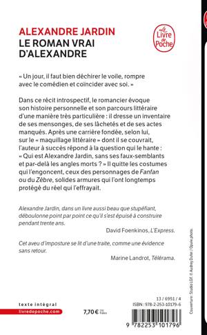 Dans ce récit introspectif, le romancier évoque son histoire personnelle et son parcours littéraire d’une manière très particulière : il dresse un inventaire de ses mensonges, de ses lâchetés et de ses actes manqués. Après une carrière fondée, selon lui, sur le « maquillage littéraire » dont il se couvrait, l’auteur à succès répond à la question qui le hante : « Qui est Alexandre Jardin, sans ses faux-semblants et par-delà les angles morts ? » Il quitte ses costumes qui l'engoncent, ceux des personnages de Fanfan ou du Zèbre, solides armures qui l'ont longtemps protégé du réel qui l'effrayait.
