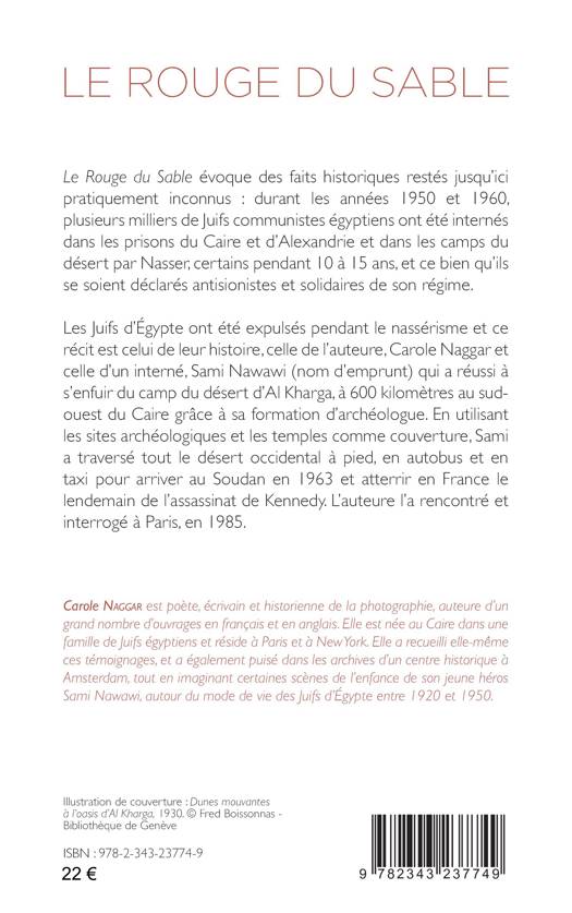 Le Rouge du Sable évoque des faits historiques restés jusqu’ici pratiquement inconnus : durant les années 1950 et 1960, plusieurs milliers de Juifs communistes égyptiens ont été internés par Nasser dans les prisons du Caire et d'Alexandrie et ce bien qu’ils se soient déclarés antisionistes et solidaires de son régime. Les Juifs d’Égypte ont été expulsés pendant le nassérisme et ce récit est celui de leur histoire, celle de l’auteure, Carole Naggar et celle d’un interné qui a réussi à s’enfuir du camp du désert d’Al Kharga grâce à sa formation d’archéologue. En utilisant les sites archéologiques comme couverture, il a traversé tout le désert occidental à pied et en autobus pour arriver au Soudan en 1963 et atterrir en France le lendemain de l’assassinat de Kennedy. L’auteure l’a rencontré et interrogé à Paris, en 1985.