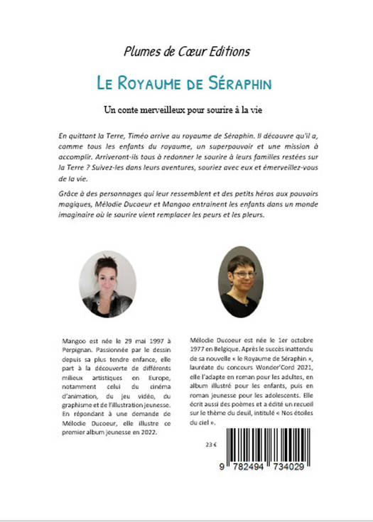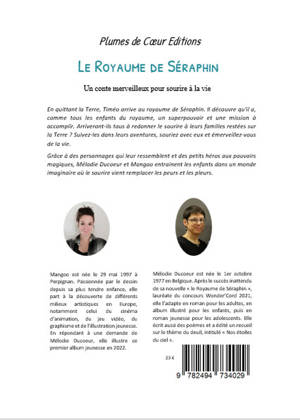 En quittant la Terre, Timéo arrive au royaume de Séraphin. Il découvre qu'il a, comme tous les enfants du royaume, un superpouvoir et une mission à accomplir. Arriveront-ils tous à redonner le sourire à leurs familles restées sur la Terre ? Suivez-les dans leurs aventures, souriez avec eux et émerveillez-vous de la vie. Grâce à des personnages qui leur ressemblent et des petits héros aux pouvoirs magiques, Mélodie Ducoeur et Mangoo entrainent les enfants dans un monde imaginaire où le sourire vient remplacer les peurs et les pleurs.