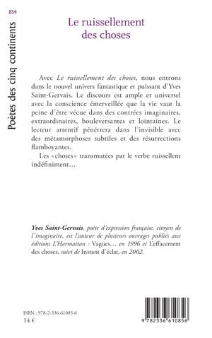 Avec Le ruissellement des choses, nous entrons dans le nouvel univers fantastique et puissant d'Yves Saint-Gervais. Le discours est ample et universel avec la conscience émerveillée que la vie vaut la peine d'être vécue dans des contrées imaginaires, extraordinaires, bouleversantes et lointaines. Le lecteur attentif pénétrera dans l'invisible avec des métamorphoses subtiles et des résurrections flamboyantes. Les choses transmutées par le verbe ruissellent indéfiniment...