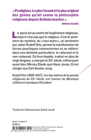 Le sacré est au centre de l'expérience religieuse, mais il n'est pas que le religieux. Il est le sentiment du mystère, du "tout autre", un sentiment qui, selon Rudolf Otto, permet la manifestation de forces psychiques inconscientes où se mêlent, dans une alchimie particulière, le rationnel et le non-rationnel. Ce livre limpide, traduit en plus de vingt langues, a marqué le XXe siècle, influençant aussi bien Mircea Eliade que Hans Jonas, Ernst Jünger que Carl-Gustav Jung.