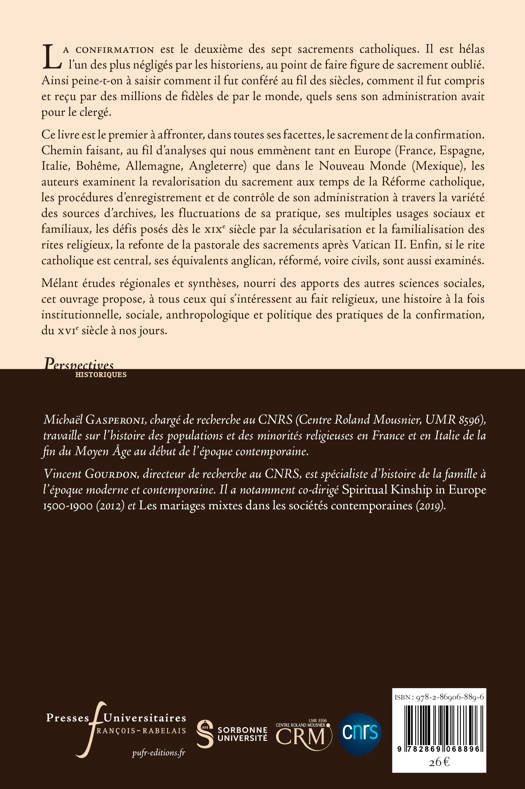 Deuxième sacrement de l’initiation chrétienne dans le catholicisme, la confirmation est pourtant l’un des plus négligés par les travaux historiques. Ainsi on peine à saisir comment il fut conféré au fil des siècles et reçu par des millions de fidèles de par le monde, quel sens son administration put avoir tant pour le clergé que pour les laïcs. De la France au Mexique en passant par l’Espagne, l’Italie, la Bohême, l’Allemagne et l’Angleterre, ce livre est le premier à explorer toutes les facettes de cette thématique. Comment la Réforme catholique a-t-elle revalorisé ce sacrement ? Comment sa pratique a-t-elle évolué ? Quels sont ses usages sociaux et familiaux ? Quels défis sont posés, dès le XIXe siècle, par la sécularisation et la familialisation des rites religieux ? Qu’en est-il de ses équivalents anglican, réformé, voire civils ? Mêlant visions synthétiques et études régionales, ce livre, qui se nourrit des apports des autres sciences sociales, propose à tous ceux qui s’intéressent au fait religieux, une histoire à la fois institutionnelle, sociale, anthropologique et politique des pratiques de la confirmation, du XVIe siècle à nos jours.