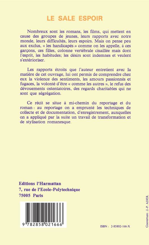 Nombreux sont les romans qui mettent en cause des groupes de jeunes, leurs rapports au monde, leurs difficultés et leurs espoirs. Mais on pense peu aux "exclus", les "handicapés" comme on les appelle, colonné vertébrale cisaillée mais dont l'esprit, les habitudes et les désirs sont indemnes et vzeulent s'extérioriser. Ce récit se situe à mi-chemin du reportage et dur roman: au reportage, on a emprunté les techniques de collecte, de documentation et d'enregistrement auxquelles onn a appliqué un travail de transformationet de stylisation romanesque.