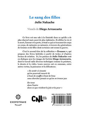 Ce livre est une ode à la féminité dans ce qu’elle a de plus charnel mais aussi de plus éphémère. Il célèbre la vie et la mort, l’amour et la perte, et tout ce qui se transmet de corps en corps, de mémoire en mémoire, à travers des générations de femmes et de filles dont certaines ont connu la guerre. C’est le second titre de la collection « Écumes », qui propose des livres hybrides à partir de textes et d’autres formes de création. Ici, les poèmes de Julie Nakache sont en dialogue avec les images de l’artiste Diego Arrascaeta, dont le travail mêle diverses techniques comme la peinture, le dessin et la vidéo. Leurs œuvres ont en commun, entre autres vertus, la puissance et la délicatesse.