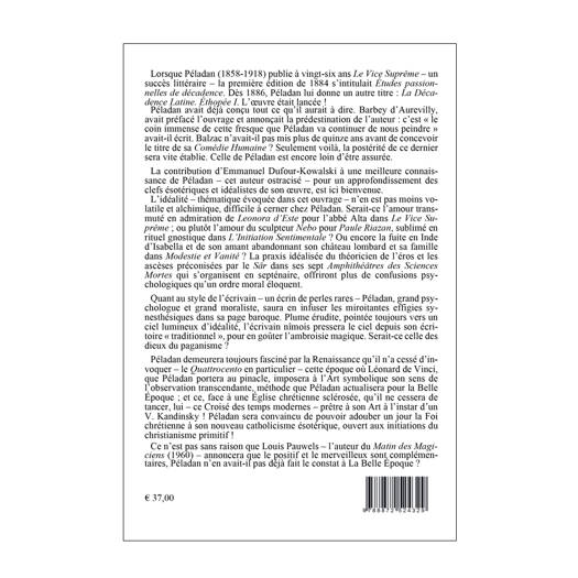 « Lorsque Péladan publie à vingt-six ans Le Vice Suprême – un succès littéraire – la première édition de 1884 s’intitulait Études passionnelles de décadence. Dès 1886, Péladan lui donne un autre titre : La Décadence Latine. Éthopée I. Péladan avait déjà conçu tout ce qu’il aurait à dire. Barbey d’Aurevilly, avait préfacé l’ouvrage et annonçait la prédestination de l’auteur : c’est « le coin immense de cette fresque que Péladan va continuer de nous peindre » avait-il écrit. La contribution de Dufour-Kowalski à une meilleure connaissance de cet auteur ostracisé, pour un approfondissement des clefs ésotériques et idéalistes de son oeuvre, est ici bienvenue. L’idéalité – thématique évoquée dans cet ouvrage – n’en est pas moins volatile et alchimique, difficile à cerner chez Péladan.