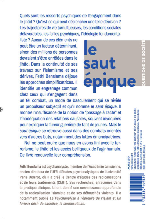 Quels sont les ressorts psychiques de l'engagement dans le jihâd ? Qu'est-ce qui peut déclencher une telle décision ? Les trajectoires de vie tumultueuses, les conditions sociales défavorables, les failles psychiques, l'idéologie fondamentaliste ? Aucun de ces éléments ne peut être un facteur déterminant, sinon des millions de personnes devraient s'être enrôlées dans le jihâd. Dans la continuité de ses travaux sur l'islamisme et ses dérives, Fethi Benslama déjoue les approches simplificatrices. Il identifie un engrenage commun chez ceux qui s'engagent dans un tel combat, un mode de basculement qui se révèle un propulseur subjectif et qu'il appelle «le saut épique». Il montre l'insuffisance de la notion de "passage à l'acte" et l'inadéquation des relations causales, souvent invoquées pour expliquer la fureur guerrière de tant de jeunes. Mais le «saut épique» se retrouve aussi dans des combats orientés vers d'autres buts, notamment des luttes émancipatrices.