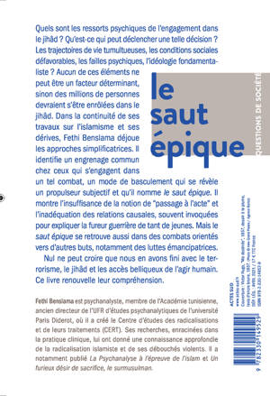 «Fethi Benslama est psychanalyste, membre de l'Académie »«tunisienne, ancien directeur de l'ufr d'études »«psychanalytiques de l'université Paris Diderot, où il a créé »«le Centre d'études des radicalisations et de leurs traitements (cert)»«.»« Ses recherches, enracinées dans la pratique clinique, lui ont donné une connaissance approfondie de la radicalisation islamiste et de ses débouchés violents. Il a notamment publié »La Psychanalyse à l'épreuve de l'islam «et »Un furieux désir de sacrifice, le surmusulman.