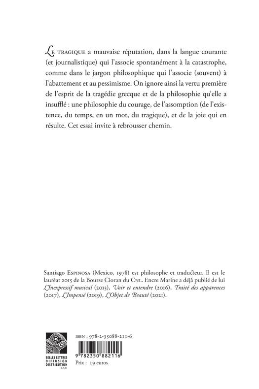 Le tragique a mauvaise reputation, dans la langue courante (et journalistique) qui l'associe spontanement a la catastrophe, comme dans le jargon philosophique qui l'associe (souvent) a l'abattement et au pessimisme. On ignore ainsi la vertu premiere de l'esprit de la tragedie grecque et de la philosophie qu'elle a insuffle: une philosophie du courage, de l'assomption (de l'existence, du temps, en un mot, du tragique), et de la joie qui en resulte. Cet essai invite a rebrousser chemin.