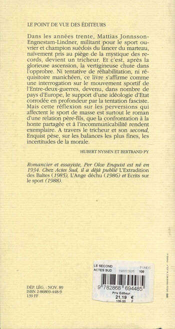 Dans les années trente, Mattias Jonnsson-Engnestam-Lindner, militant pour le sport ouvrier et champion suédois du lancer du marteau, naïvement pris au piège de la mystique des records, devient un tricheur. Et c'est, après la glorieuse ascension, la vertigineuse chute dans l'opprobre. Ni tentative de réhabilitation, ni réquisitoire manichéen, ce livre s'affirme comme une interrogation sur le mouvement sportif de l'Entre-deux-guerres, devenu, dans nombre de pays d'Europe, le support d'une idéologie d'Etat corrodée en profondeur par la tentation fasciste. Mais cette réflexion sur les perversions qui affectent le sport de masse est surtout le roman d'une relation père-fils, que la confrontation à la honte partagée et à l'incommunicabilité rendent exemplaire. A travers le tricheur et son second, Enquist pèse, sur les balances les plus fines, les incertitudes de la morale.