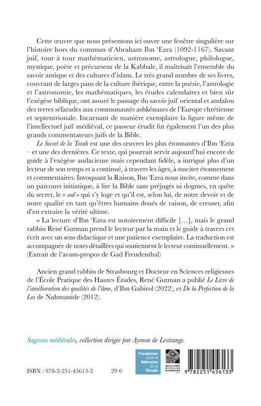 Le Secret de la Torah est une des oeuvres les plus étonnantes d’Ibn ʿEzra – et une des dernières. Ce texte qui pourrait servir aujourd’hui encore de guide, exégète audacieux et cependant fidèle d’une « féconde ambiguïté » (J. C. Attias), a intrigué plus d’un lecteur de son temps et a continué, à travers les âges, à susciter étonnement et commentaires. Invoquant la Raison, Ibn ʿEzra nous invite, comme dans un parcours initiatique, à lire la Bible sans préjugés ni dogmes, en quête du secret, le « sod » qui s’y loge et qu’il est, selon lui, de notre devoir et de notre qualité en tant qu’êtres humains doués de raison, de creuser, afin d’en extraire la vérité ultime.