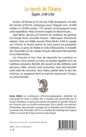 Toulon, 29 floréal an VI (18 mai 1798). Bonaparte, à la tête de l'armée d'Orient, embarque pour l'Égypte avec 32 000 soldats et 10 000 marins. 170 savants accompagnent aussi cette expédition. Mais l'ennemi anglais ne désarme pas. Jean Nérac, devenu un homme de confiance du général, est chargé d'une nouvelle mission : débusquer d'éventuels espions. Avec son fidèle second, Pierre Bertin, il fait le voyage sur L'Orient, le navire amiral. Ils vont suivre les péripéties militaires, la prise de Malte et celle d'Alexandrie, la bataille des Pyramides où les soldats français affrontent Mourad Bey et ses Mamelouks. Les Français et leur rêve de répandre les Lumières se heurtent, à leur arrivée au Caire, au peuple égyptien et à ses traditions séculaires. Bientôt, des savants et des militaires sont pris pour cible, certains sont assassinés. Jean doit élucider cette série de meurtres. Seul indice, planté dans le dos des victimes, un poignard dont le manche représente l'Uræus, un cobra femelle