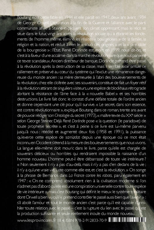 « Par toute une part de lui-même, Pierre Boutang est tourné vers le passé de l'esprit et du coeur français. C'est ainsi, du moins, qu'on peut le juger mal et se tromper sur lui. Car il n'est pas tourné vers le passé, il en vient, il est projeté par lui. Le voici parmi nous, dans le temps des grandes confusions. Armé d'une lucidité implacable, d'une sagesse qui ne s'avoue pas vaincue, c'est pourtant un homme de 1947. Ces mythes qu'il propose sont nés de cette adaptation de l'éternité au présent, à l'actualité la plus menaçante. Nous présentons une oeuvre qui fera date dans l'histoire de la pensée contemporaine française. Seront nombreux ceux qui ne s'en rendront pas compte. Le public va à ce qu'il reconnaît, ne s'engage que sur des chemins mille fois retournés. Nous lui présentons une route nouvelle, qui n'est pas encore toute défrichée. » La Table Ronde, Prière d'insérer de 1947.