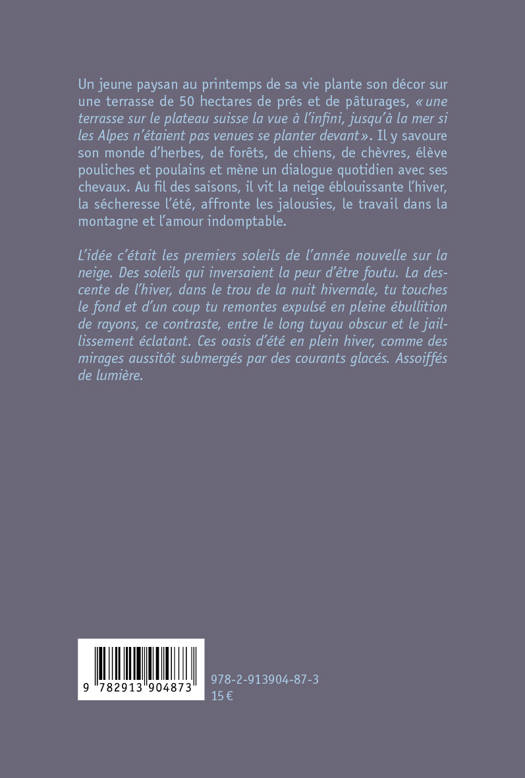 Un jeune paysan au printemps de sa vie plante son décor sur une terrasse de 50 hectares de prés et de pâturages, « une terrasse sur le plateau suisse la vue à l’infini, jusqu’à la mer si les Alpes n’étaient pas venues se planter devant ». Il y savoure son monde d’herbes, de forêts, de chiens, de chèvres, élève pouliches et poulains et mène un dialogue quotidien avec ses chevaux. Au fil des saisons, il vit la neige éblouissante l’hiver, la sécheresse l’été, affronte les jalousies, le travail dans la montagne et l’amour indomptable.« L’idée c’était les premiers soleils de l’année nouvelle sur la neige. Des soleils qui inversaient la peur d’être foutu. La descente de l’hiver, dans le trou de la nuit hivernale, tu touches le fond et d’un coup tu remontes expulsé en pleine ébullition de rayons, ce contraste, entre le long tuyau obscur et le jaillissement éclatant. Ces oasis d’été en plein hiver, comme des mirages aussitôt submergés par des courants glacés. Assoiffés de lumière. »