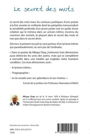 Le secret des mots trace les contours poétiques d'une poésie à la fois vivante et vivifiante dont les péripéties transcendent la sensibilité profonde d'un jeune poète noir en quête d'une création qui le mènera dans un univers intime, inconnu du commun des mortels, le plaçant dans le secret des mots et non pas dans le secret divin.