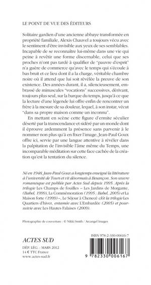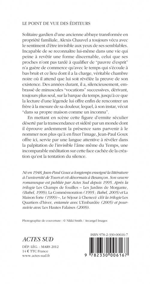 Solitaire gardien d'une ancienne abbaye transformée en propriété familiale, Alexis Chauvel a toujours vécu avec le sentiment d'être invisible aux yeux de ses semblables. Incapable de se reconnaître lui-même dans une vie qui peine à revêtir une forme discernable, celui que ses proches n'ont pas tardé à qualifier de "pauvre d'esprit" n'a guère de commerce qu'avec le temps qui s'écoule à bas bruit et ce lieu dont il a la charge, véritable chambre noire où il attend que lui soit révélée la preuve de son existence. Des années durant, il a, silencieusement, embrassé de minuscules "vocations" successives, dérivant, toujours plus seul, sur la barque du temps, jusqu'à ce que la lecture d'une légende lui offre enfin de rencontrer un frère à la mesure de sa douleur, lequel, à son instar, vécut "dans sa propre maison comme un inconnu".