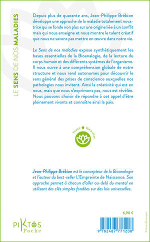 Depuis plus de quarante ans, Jean-Philippe Brébion développe une approche de la maladie totalement novatrice qui se fonde non plus sur une origine liée à un conflit mais qui nous enseigne et nous montre le talent créatif que nous ne savons pas mettre en oeuvre dans notre vie. Le Sens de nos maladies expose synthétiquement les bases essentielles de la bioanalogie, de la lecture du corps humain et des différents systèmes de l’organisme. Il nous ouvre à une compréhension globale de notre structure et nous rend autonomes pour découvrir le sens général des prises de conscience auxquelles nos pathologies nous invitent. Ainsi la créativité qui est en nous, mais que nous n’exprimons pas, nous est révélée. Nous pouvons choisir de répondre à cet appel d’être pleinement vivants et connaître ainsi la paix.