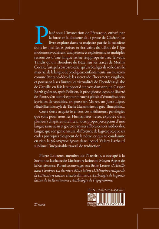 Place sous l'invocation de Petrarque, enivre par la force et la douceur de la prose de Ciceron, ce livre explore dans sa majeure partie la maniere dont les meilleurs poetes et ecrivains du debut de l'age moderne savourerent, analyserent et exploiterent les multiples ressources d'une langue latine reappropriee avec ferveur. Tandis qu'un Theodore de Beze, sur les traces de Merlin Cocaie, fustige la barbarolexie, qu'un Scaliger devoile dans le materiel de la langue de prodigieux enfantements, un musicien comme Pontano devoile les secrets de l'hexametre virgilien, et poussant a ses limites les virtualites de l'hendecasyllabe de Catulle, en fait le support d'un vers dansant, un Gaspar Barth goutant, apres Politien, la prodigieuse lecon de liberte de Plaute, s'en autorise pour former a plaisir d'etourdissantes kyrielles de vocables, en prose un Muret, un Juste-Lipse, rehabilitent le style de Tacite a la lumiere du grec Thucydide...Cette dette acquittee envers ces mediateurs privilegies que sont pour nous les Humanistes, reste, exploree dans plusieurs chapitres satellites, notre propre perception d'une langue saisie aussi et goutee dans ses efflorescences medievales, langue que son genie naturel differencie de la grecque, que ses codes poetiques eloignent de la notre, ce qui ne condamne en rien le f t's dans lequel Valery Larbaud sublime l'inepuisable travail de traduction.