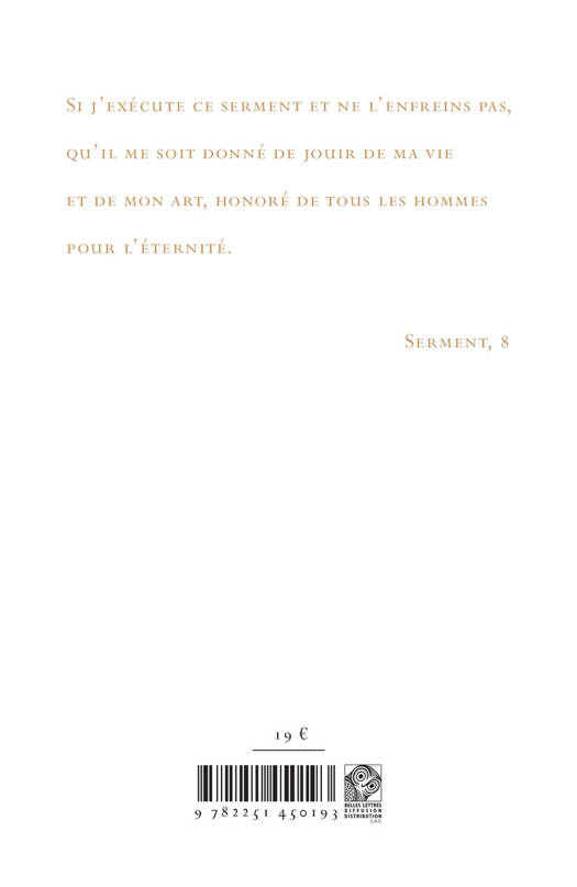 Si j'exécute ce serment et ne l'enfreins pas, qu'il me soit donné de jouir de ma vie et de mon art, honoré de tous les hommes pour l'éternité.