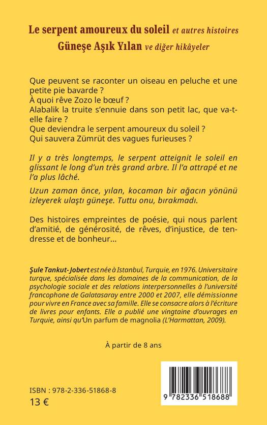 Uzun zaman önce, yılan, kocaman bir ağacın yönünü izleyerek ulaştı güneşe. Tuttu onu, bırakmadı. Des histoires empreintes de poésie, qui nous parlent d'amitié, de générosité, de rêves, d'injustice, de tendresse et de bonheur...