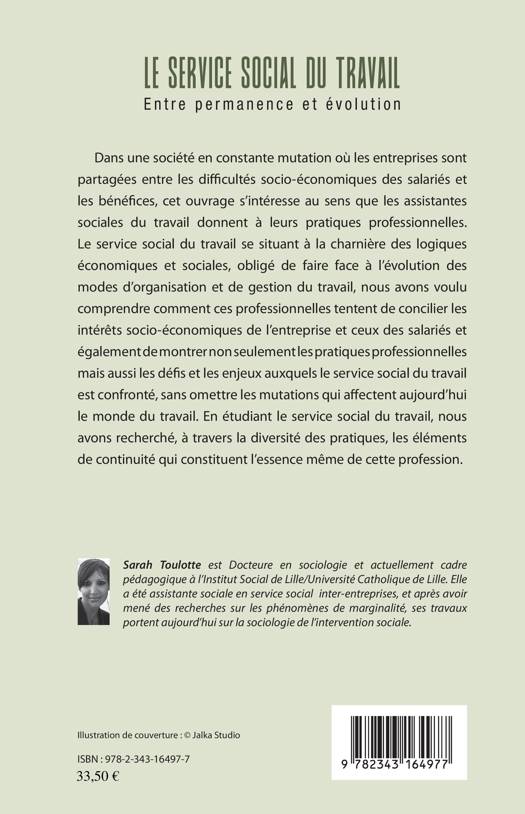 Dans une société en constante mutation où les entreprises sont partagées entre les difficultés socio-économiques des salariés et les bénéfices, cet ouvrage s'intéresse au sens que les assistantes sociales du travail donnent à leurs pratiques professionnelles. Le service social du travail se situant à la charnière des logiques économiques et sociales, obligé de faire face à l'évolution des modes d'organisation et de gestion du travail, nous avons voulu comprendre comment ces professionnelles tentent de concilier les intérêts socio-économiques de l'entreprise et ceux des salariés et également de montrer non seulement les pratiques professionnelles mais aussi les défis et les enjeux auxquels le service social du travail est confronté, sans omettre les mutations qui affectent aujourd'hui le monde du travail.