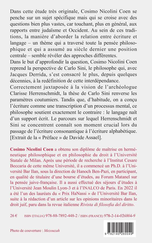 La relation entre l'écriture et la langue est ici abordée - en reprenant la pensée de Carlo Sini et Clarisse Herrenschmidt - dans le passage crucial de l'écriture consonantique à l'écriture alphabétique. C'est donc à partir de l'hébreu, que l'auteur examine les dispositifs d'assujettissement et les pratiques de subjectivation liées à la lecture.