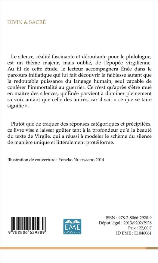 Le silence, réalité fascinante et déroutante pour le philologue, est un thème majeur, mais oublié, de l'épopée virgilienne. Au fil de cette étude, le lecteur accompagnera Énée dans le parcours initiatique qui lui fait découvrir la faiblesse autant que la redoutable puissance du langage humain, seul capable de conférer l'immortalité au guerrier. Ce n'est qu'après s'être mué en maitre des silences, qu'Énée parvient à dominer pleinement sa voix autant que celle des autres...
