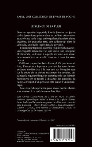 Dans un quartier huppé de Rio de Janeiro, un jeune cadre dynamique grimpe dans sa berline, dépose son attaché-case sur le siège et tire quelques bouffées d'une cigarette. Un peu plus tard, son cadavre gît dans le véhicule, une balle logée dans la cervelle. L'inspecteur Espinosa assemble les pièces du puzzle : une coquette assurance-vie, une veuve trop jolie pour être honnête, un truand à la petite semaine, une secrétaire aventurière, un ex-flic reconverti dans les assurances. Plus qu'elle n'élucide le mystère de cette mort inconcevable, l'enquête nourrit l'intrigue et les événements s'enchaînent, jusqu'à un meurtre torride commis menottes aux poignets entre des draps froissés. Préférant traquer les bons livres plutôt que les malfrats, l'inspecteur Espinosa parcourt les rues de son enfance, médite face à la mer tant sur l'enquête que sur le cours de sa propre existence. Le policier, qui partage la rigueur éthique et esthétique de son lointain homonyme en se tenant à distance des passions de l'âme, a l'esprit d'un penseur et le coeur d'un romantique. Mais assez d'expérience pour savoir que les choses sont rarement ce qu'elles semblent être.