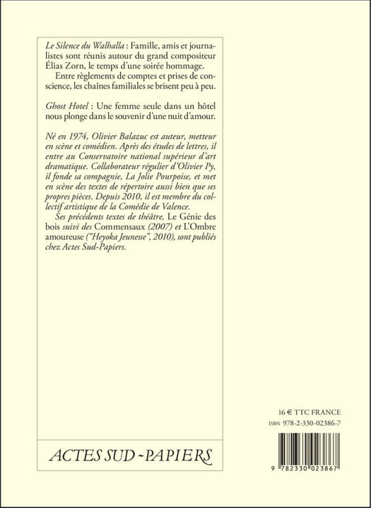 «Ses précédentas textes de théâtre, »Le Génie des bois «suivi de »Les Commensaux« (2007) et »L'Ombre amoureuse« ("Heyoka Jeunesse", 2010) sont publiés chez Actes Sud-Papiers.»