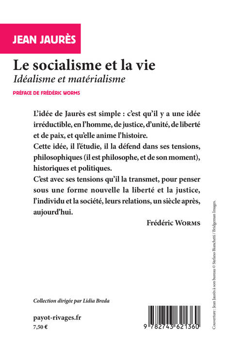 L'idée de Jaurès est simple : c'est qu'il y a une idée irréductible, en l'homme, de justice, d'unité, de liberté et de paix, et qu'elle anime l'histoire. Cette idée, il l'étudie, il la défend dans ses tensions philosophiques (il est philosophe, et de son moment), historiques et politiques. C'est avec ses tensions qu'il la transmet, pour penser sous une forme nouvelle la liberté et la justice, l'individu et la société, leurs relations, un siècle après, aujourd'hui. Frédéric Worms