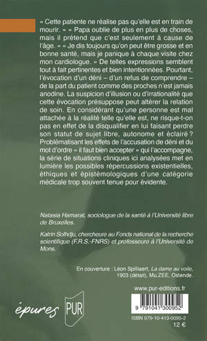 « Cette patiente ne réalise pas qu’elle est en train de mourir. » « Papa oublie de plus en plus de choses, mais il prétend que c’est seulement à cause de l’âge. » « Je dis toujours qu’on peut être grosse et en bonne santé, mais je panique à chaque visite chez mon cardiologue. » De telles expressions semblent tout à fait pertinentes et bien intentionnées. Pourtant, l’évocation d’un déni – d’un refus de comprendre – de la part du patient comme des proches n’est jamais anodine. La suspicion d’illusion ou d’irrationalité que cette évocation présuppose peut altérer la relation de soin. En considérant qu’une personne est mal attachée à la réalité telle qu’elle est, ne risque-t-on pas en effet de la disqualifier en lui faisant perdre son statut de sujet libre, autonome et éclairé ? Problématisant les effets de l’accusation de déni et du mot d’ordre « il faut bien accepter » qui l’accompagne, la série de situations cliniques ici analysées met en lumière les possibles répercussions existentielles, éthiques et épistémologiques d’une catégorie médicale trop souvent tenue pour évidente.