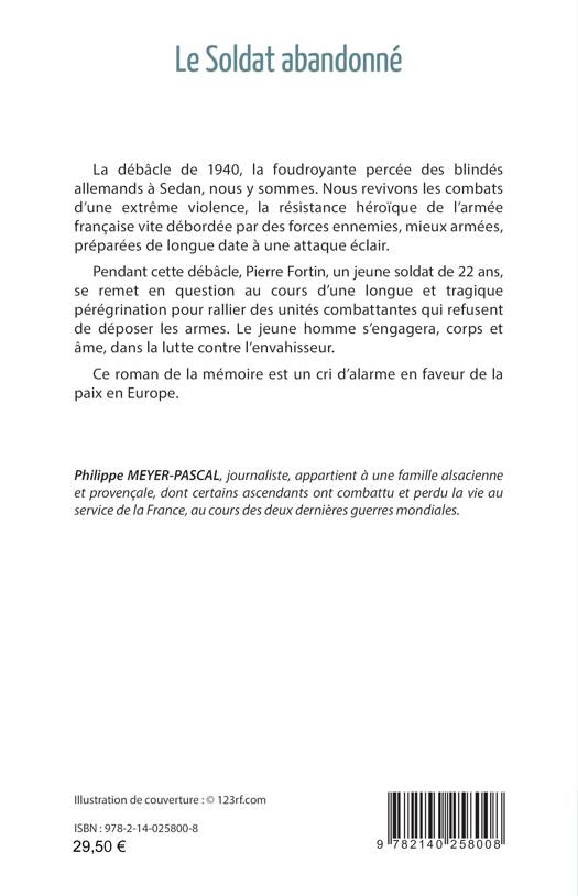 La débâcle de 1940, la foudroyante percée des blindés allemands à Sedan, nous y sommes. Nous revivons les combats d’une extrême violence, la résistance héroïque de l’armée française vite débordée par des forces ennemies, mieux armées, préparées de longue date à une attaque éclair. Pendant cette débâcle, Pierre Fortin, un jeune soldat de 22 ans, se remet en question au cours d’une longue et tragique pérégrination pour rallier des unités combattantes qui refusent de déposer les armes. Le jeune homme s’engagera, corps et âme, dans la lutte contre l’envahisseur. Ce roman de la mémoire est un cri d’alarme en faveur de la paix en Europe.