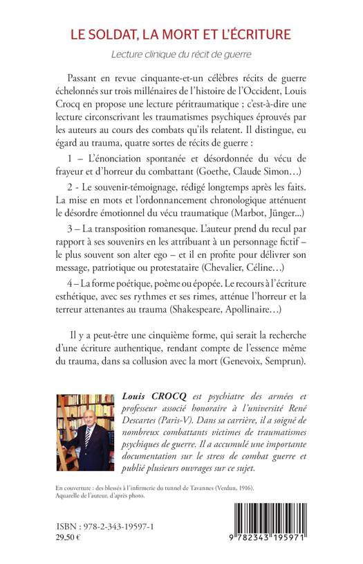 Passant en revue cinquante-et-un célèbres récits de guerre échelonnés sur trois millénaires de l'histoire de l'Occident, Louis Crocq en propose une lecture péritraumatique, c'est-à-dire une lecture circonscrivant les traumatismes psychiques éprouvés par les auteurs au cours des combats qu'ils relatent. Il distingue, eu égard au trauma, quatre sortes de récits de guerre : L'énonciation spontanée et désordonnée du vécu de frayeur et d'horreur du combattant ; Le souvenir-témoignage, rédigé longtemps après les faits ; La transposition romanesque ; La forme poétique, poème ou épopée.