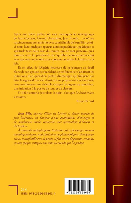 Jean Biès livre ici quelques aperçus autobiographiques, poétiques et spirituels. De l'Algérie heureuse de son enfance au deuil de son épouse, se succèdent, se renforcent et s'éclairent les initiations d'un quotidien parfois dramatique qui finissent par faire la sagesse d'une vie. Ainsi ce livre propose-t-il à ses lecteurs un véritable viatique de sagesse au quotidien, une initiation à la portée de tous et de chacun.