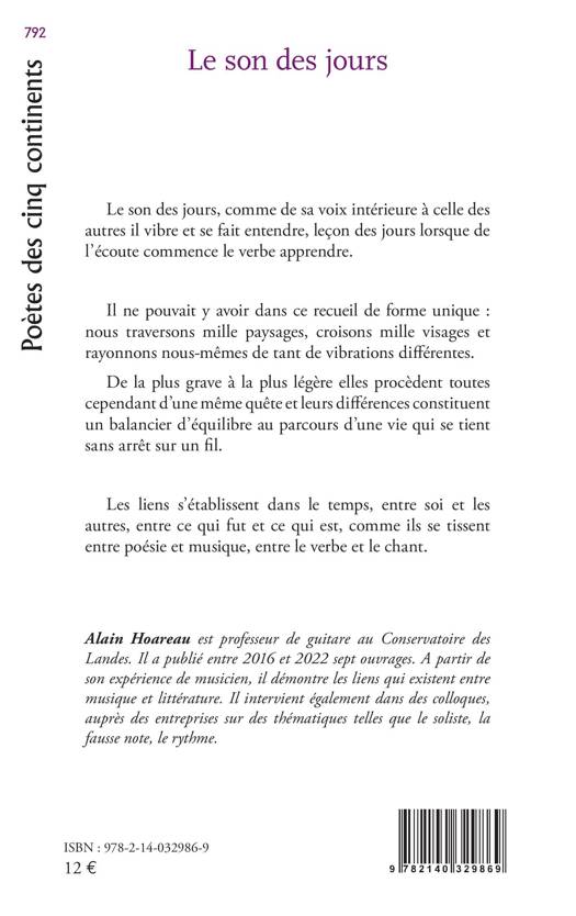 Le son des jours, comme de sa voix intérieure à celle des autres il vibre et se fait entendre, leçon des jours lorsque de l'écoute commence le verbe apprendre. Il ne pouvait y avoir dans ce recueil de forme unique: nous traversons mille paysages, croisons mille visages et rayonnons nous-mêmes de tant de vibrations différentes. De la plus grave à la plus légère elles procèdent toutes cependant d'une même quête et leurs différences constituent un balancier d'équilibre au parcours d'une vie qui se tient sans arrêt sur un fil. Les liens s'établissent dans le temps, entre soi et les autres, entre ce qui fut et ce qui est, comme ils se tissent entre poésie et musique, entre le verbe et le chant.