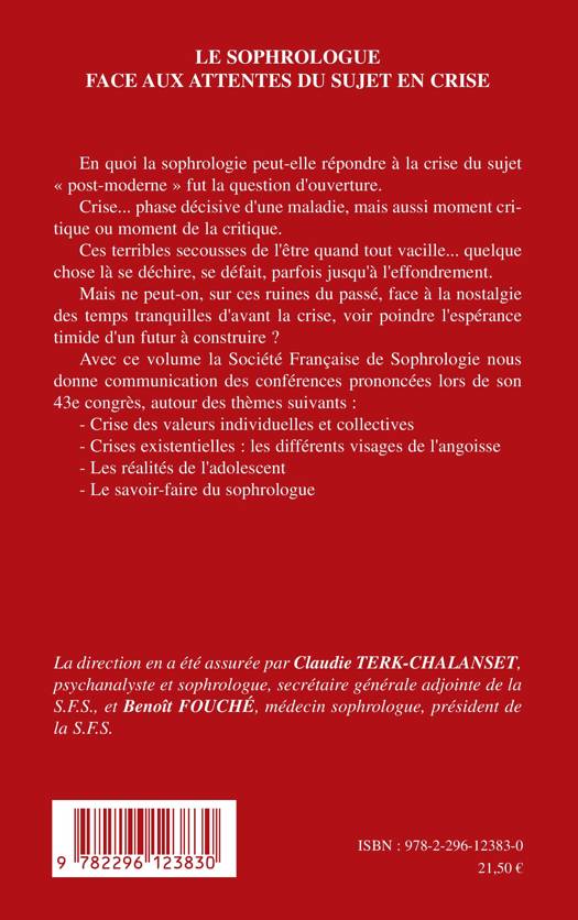 En quoi la sophrologie peut-elle répondre à la crise du sujet "post-moderne"? Ne peut-on sur les ruines du passé, face à la nostalgie des temps tranquilles d'avant la crise, voir poindre l'espérance timide d'un futur à construire ? Avec ce volume la Société Française de Sophrologie donne communication autour des thèmes suivants : - crise des valeurs individuelles et collectives - crises existentielles : les différents visages de l'angoisse - le réalités de l'adolescent - le savoir-faire du sophrologue.