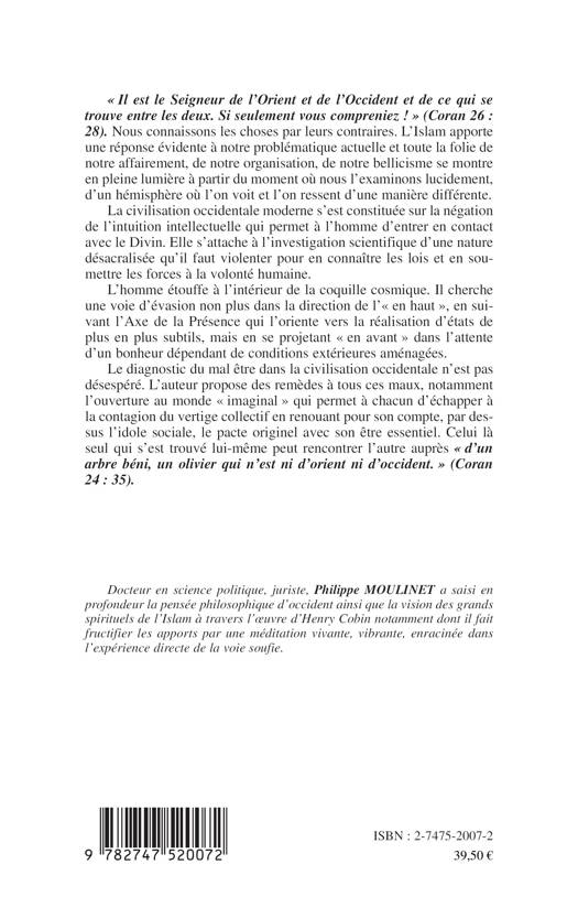 Le soufisme est une science qui initie l'homme à la connaissance de soi en lui montrant la voie du retour vers son Dieu. L'auteur a saisi en profondeur la pensée philosophique d'occident ainsi que la vision des grands spirituels de l'Islam à travers l'œuvre d'Henry Corbin notamment dont il fait fructifier les apports par une méditation vivante, enracinée dans l'expérience directe de la voie soufie. Le premier volume montre tout l'art du maître spirituel qui utilise les situations quotidiennes pour ôter au disciple la prétention à se faire une image " suffisante " de lui-même. Le deuxième tome nous ouvre un autre monde, celui de l'Imagination divine où l'âme humaine configure le scénario de son existence en vertu de la loi de correspondance qui unit nos aspirations intimes à ce qui nous vient de l'extérieur. Enfin le troisième volume propose des remèdes aux maux de la civilisation occidentale.