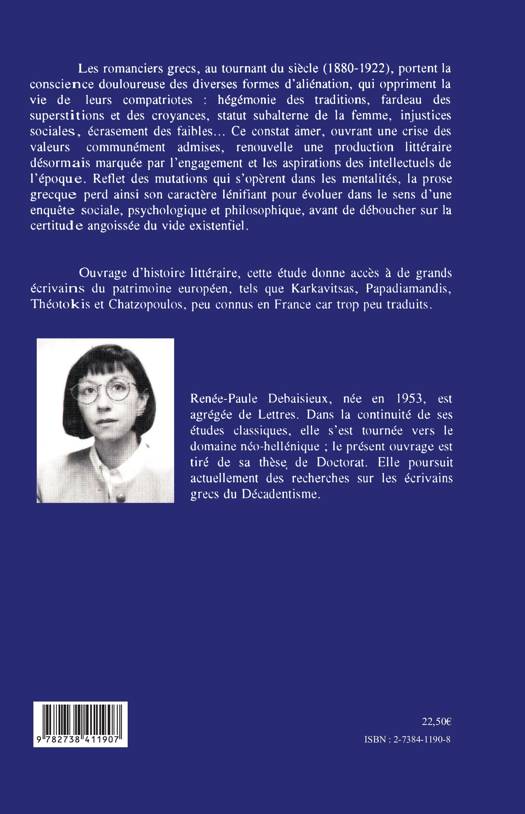 Les romanciers grecs, au tournant du siècle (1880-1922), portent la conscience douloureuse des diverses formes d'aliénation, qui oppriment la vie de leurs compatriotes : hégémonie des traditions, fardeau des superstitions et des croyances, statut subalterne de la femme, injustices sociales, écrasement des faibles...