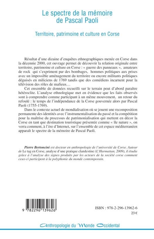 Cet ouvrage permet de découvrir la relation originale entre territoire, patrimoine et culture en Corse : "guerre des panneaux", amateurs de rock qui s'expriment par des bombages, hommes politiques face à un impossible aménagement du territoire, militants politiques déguisés en miliciens de 1769... L'analyse ethnologique de ces données montre qu'elles sont issues d'un même retour du refoulé : le temps de l'indépendance de la Corse gouvernée alors par Pascal Paoli (1755-1769).